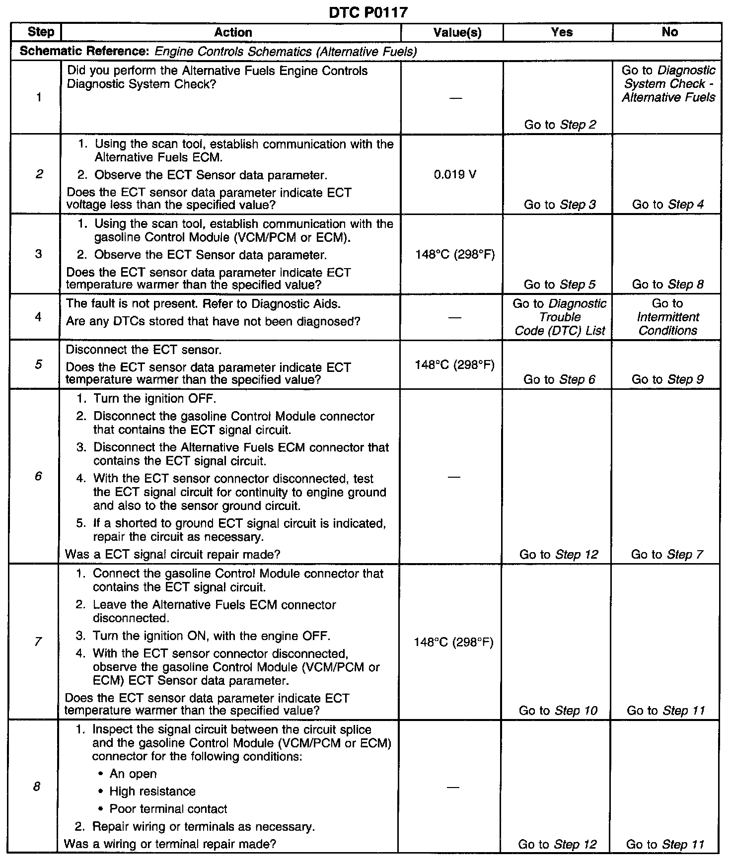 The Alternative Fuels ECM monitors an ECT sensor signal voltage of less than 0.019 volts for at least 5 seconds continuously.