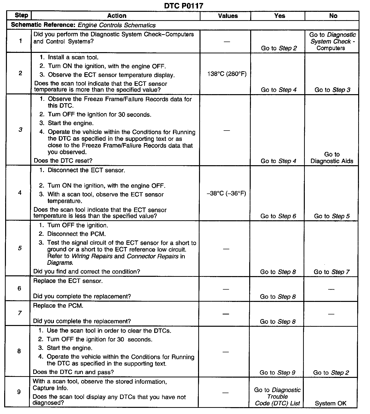 3. If DTC P0117 can only be repeated by duplicating the Failure Records, refer to Temperature vs Resistance. The table may be used to test the ECT sensor at various temperatures to evaluate the possibility of a shifted sensor that may be shorted above or below a certain temperature. If this is the case, replace the ECT sensor. If the ECT sensor appears to be OK, the malfunction is intermittent. Refer to Diagnostic Aids.
