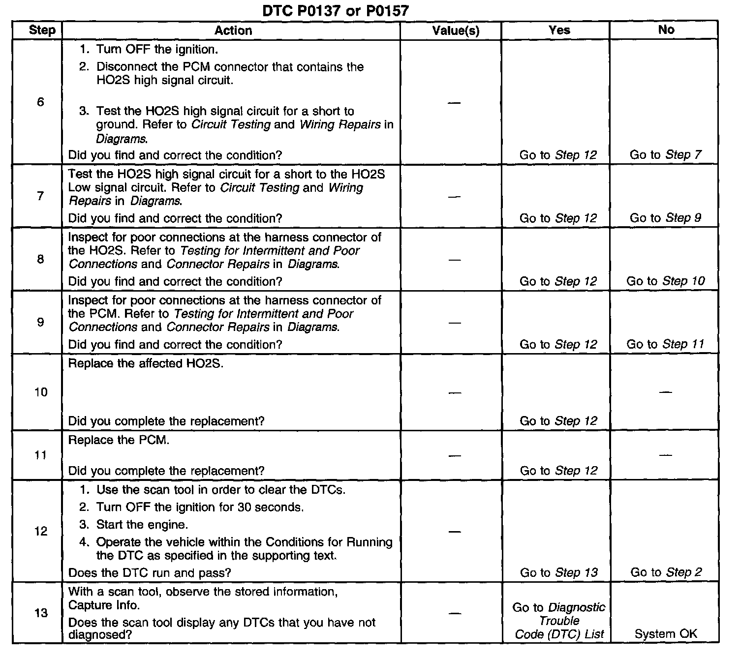 The numbers below refer to the step numbers on the diagnostic table.