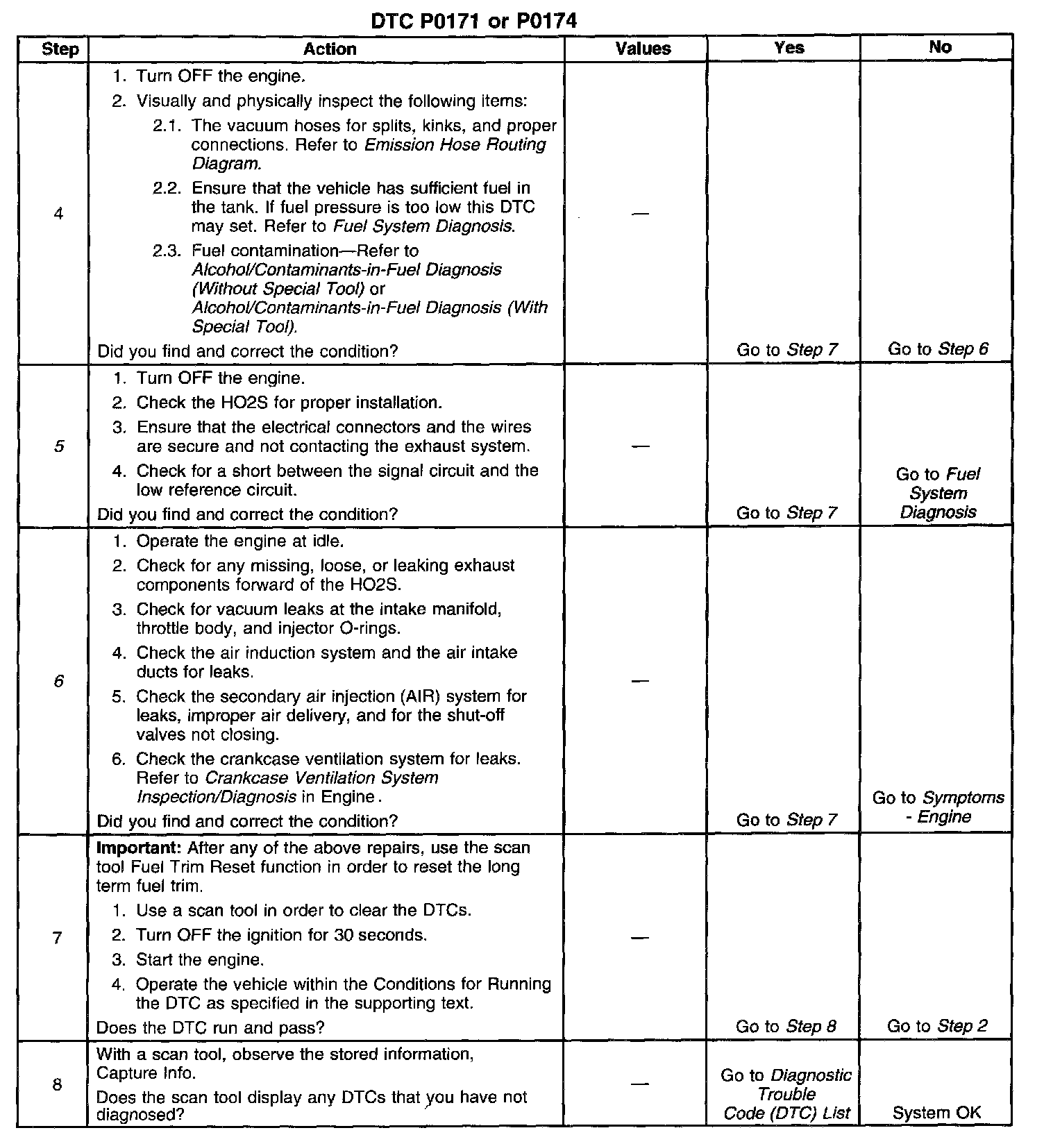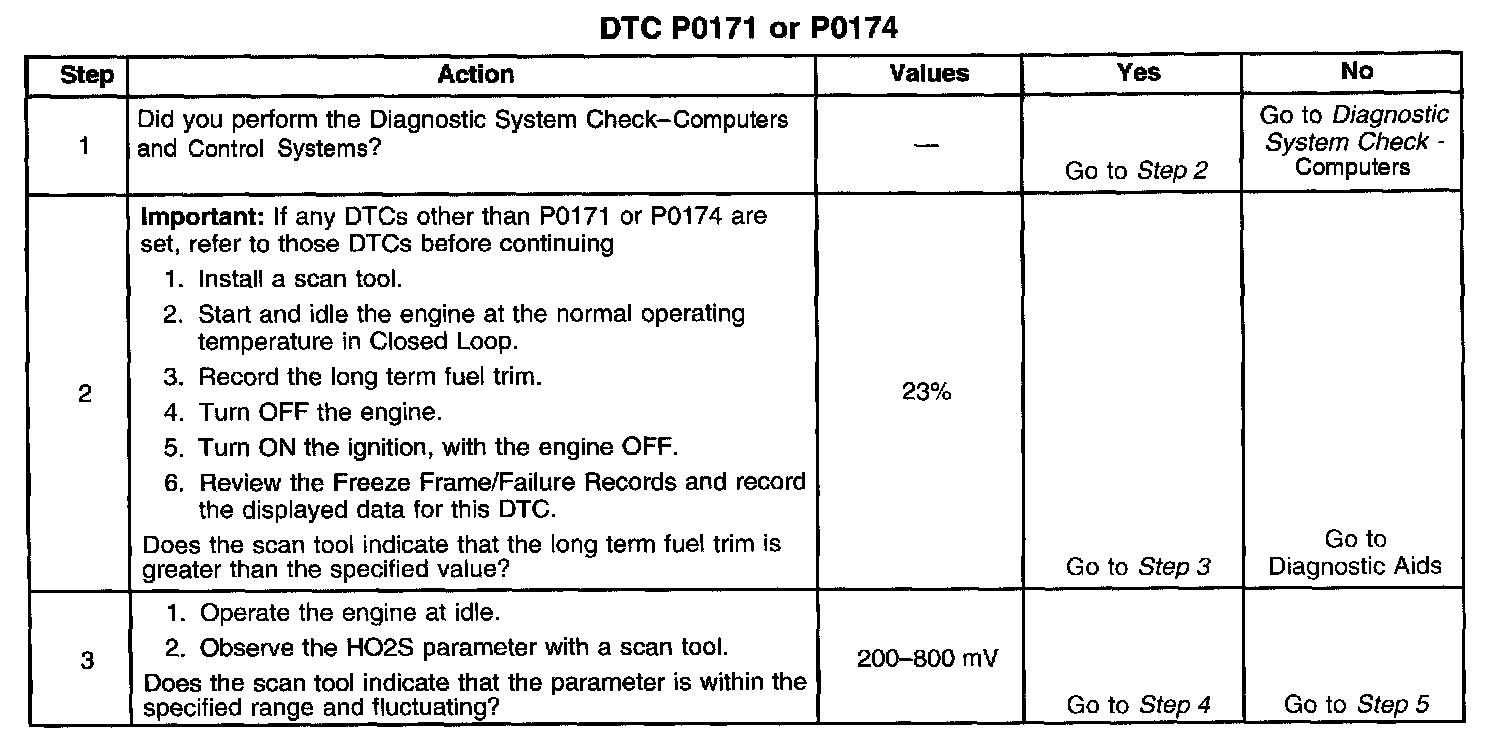 CIRCUIT DESCRIPTIONThe Powertrain Control Module (PCM) controls the air/fuel metering system in order to provide the best possible combination of driveability, fuel economy, and emission control. Fuel delivery is controlled differently during Open Loop and Closed Loop. During Open Loop, the PCM determines fuel delivery based on sensor signals without oxygen sensor input. During Closed Loop, the oxygen sensor inputs are added and used by the PCM to calculate short and long term fuel trim fuel delivery adjustments. If the oxygen sensors indicate a lean condition, fuel trim values will be above 0 percent. If the oxygen sensors indicate a rich condition, fuel trim values will be below 0 percent. Short term fuel trim values change rapidly in response to the Heated Oxygen Sensor (HO2S) voltage signals. Long term fuel trim makes coarse adjustments in order to maintain an air/fuel ratio of 14.7:1. If the PCM detects an excessively lean condition, this Diagnostic Trouble Code (DTC) will set.