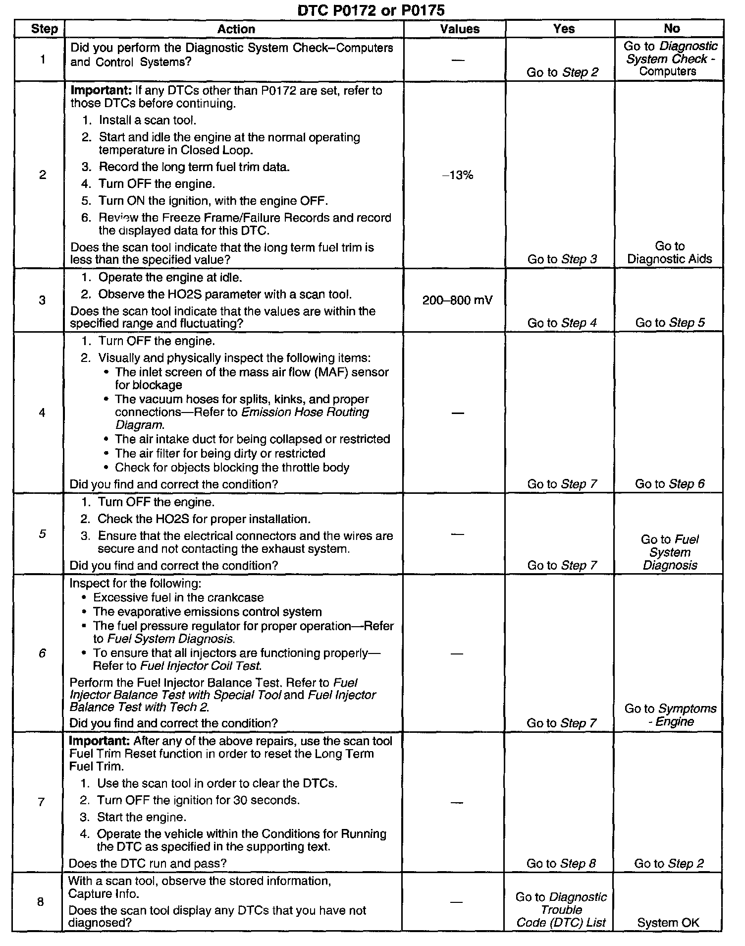CIRCUIT DESCRIPTIONThe Powertrain Control Module (PCM) controls the air/fuel metering system in order to provide the best possible combination of driveability, fuel economy, and emission control. Fuel delivery is controlled differently during Open Loop and Closed Loop. During Open Loop the PCM determines fuel delivery based on sensor signals without oxygen sensor input. During Closed Loop, the oxygen sensor inputs are added and used by the PCM to calculate short and long term fuel trim fuel delivery adjustments. If the oxygen sensors indicate a lean condition, the fuel trim values will be above 0 percent. If the oxygen sensors indicate a rich condition, the fuel trim values will be below 0 percent. Short term fuel trim values change rapidly in response to the Heated Oxygen Sensor (HO2S) voltage signals. Long term fuel trim makes coarse adjustments in order to maintain an air/fuel ratio of 14.7:1. The fuel trim diagnostic will conduct a test to determine if a rich failure actually exists, or if excessive vapor from the Evaporative Emission (EVAP) canister is causing a rich condition. If the PCM detects an excessively rich condition, this Diagnostic Trouble Code (DTC) will set. If the PCM detects excessive vapor, then a pass is logged.