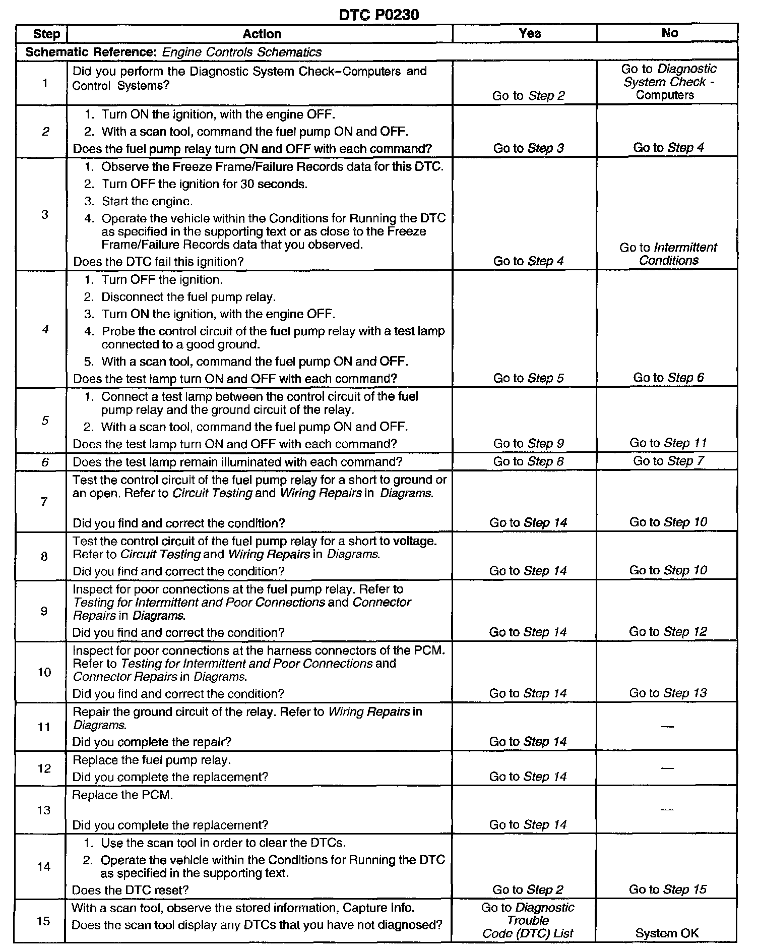 CIRCUIT DESCRIPTIONThe Powertrain Control Module (PCM) provides ignition positive voltage to the coil side of the fuel pump relay. When the ignition switch is first turned ON, the PCM energizes the fuel pump relay, which applies power to the fuel pump. The PCM enables the fuel pump relay as long as the engine is cranking or running and crankshaft reference pulses are received. If no crankshaft reference pulses are received, the PCM de-energizes the fuel pump relay after 2 seconds. The PCM monitors the voltage on the fuel pump relay control circuit. If the PCM detects an incorrect voltage on the fuel pump relay control circuit, DTC P0230 sets.