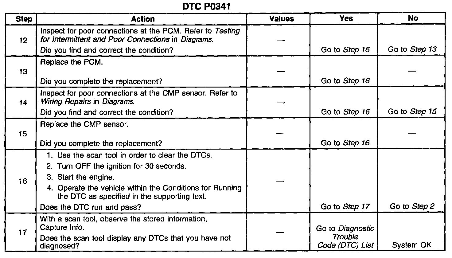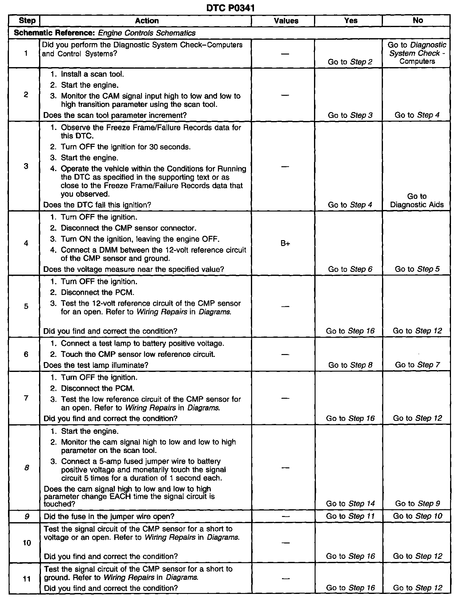 CIRCUIT DESCRIPTIONThe Camshaft Position (CMP) sensor is a sensor designed to detect changes in a magnetic field. The control module supplies the CMP sensor with a 12-volt reference, a low reference, and a signal circuit. The CMP sensor produces a magnetic field whenever the ignition is ON. The CMP sensor is mounted near a reluctor wheel that is attached to the distributor shaft. When the distributor shaft rotates, or when the engine is cranking or running, the reluctor wheel changes the magnetic field. The CMP sensor converts each change in the magnetic field into a PULSE. The number of teeth on the reluctor wheel determines how many pulses the CMP sensor detects per camshaft rotation. The control module uses the CMP sensor signal in order to calculate the correct timing for sequential fuel injection. If the Powertrain Control Module (PCM) does not detect the CMP signal while the engine is running, this Diagnostic Trouble Code (DTC) will set.