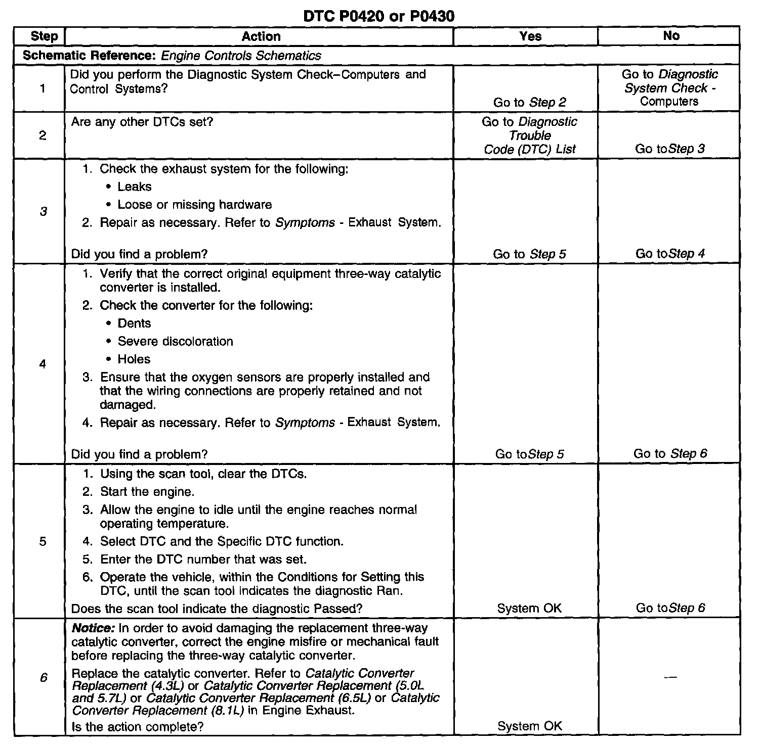 3. This table checks for conditions that can cause the three-way catalytic converter efficiency to appear degraded. Inspect and repair exhaust system as necessary.