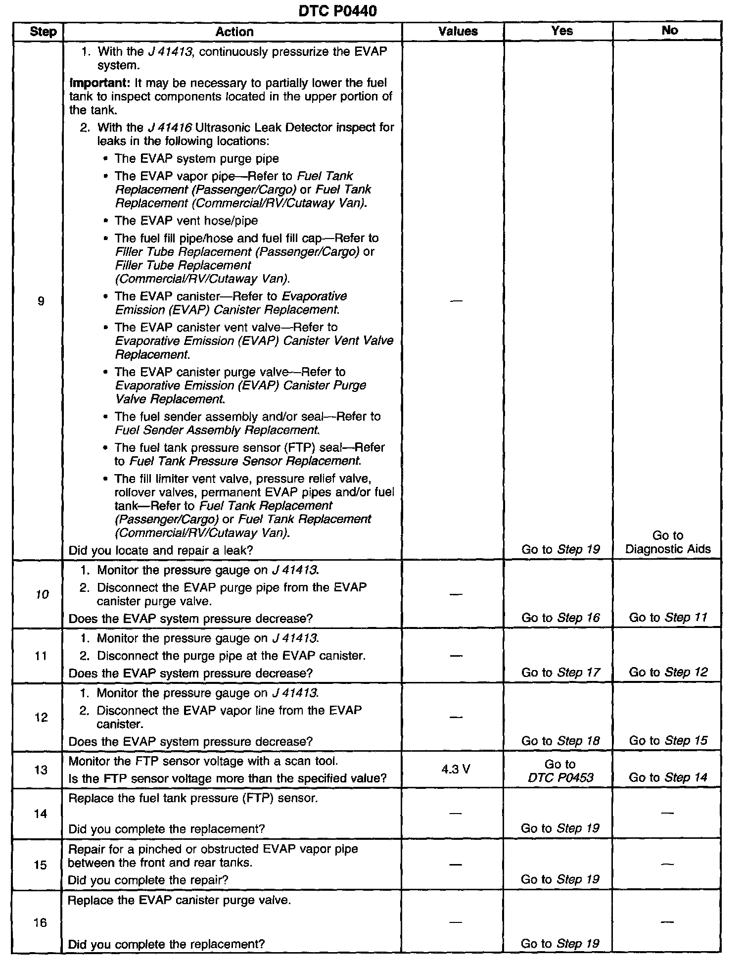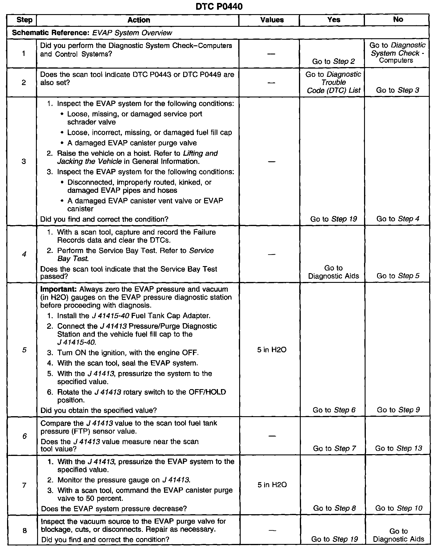 DESCRIPTIONThe EVAP LARGE LEAK TEST applies vacuum to the Evaporative Emission (EVAP) system and monitors vacuum decay. The control module uses the input from the Fuel Tank Pressure (FTP) sensor in order to determine the rate of vacuum decay. At an appropriate time, the control module turns the EVAP canister purge valve ON (open) and the EVAP canister vent valve ON (closed). This allows the engine to draw a vacuum on the system. At a calibrated time or vacuum level, the control module turns the purge valve OFF (closed), and tests the system vacuum. If the system is unable to achieve the calibrated vacuum control module, DTC P0440 will set.