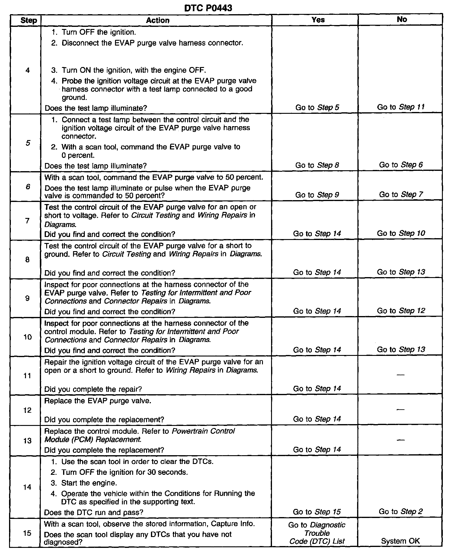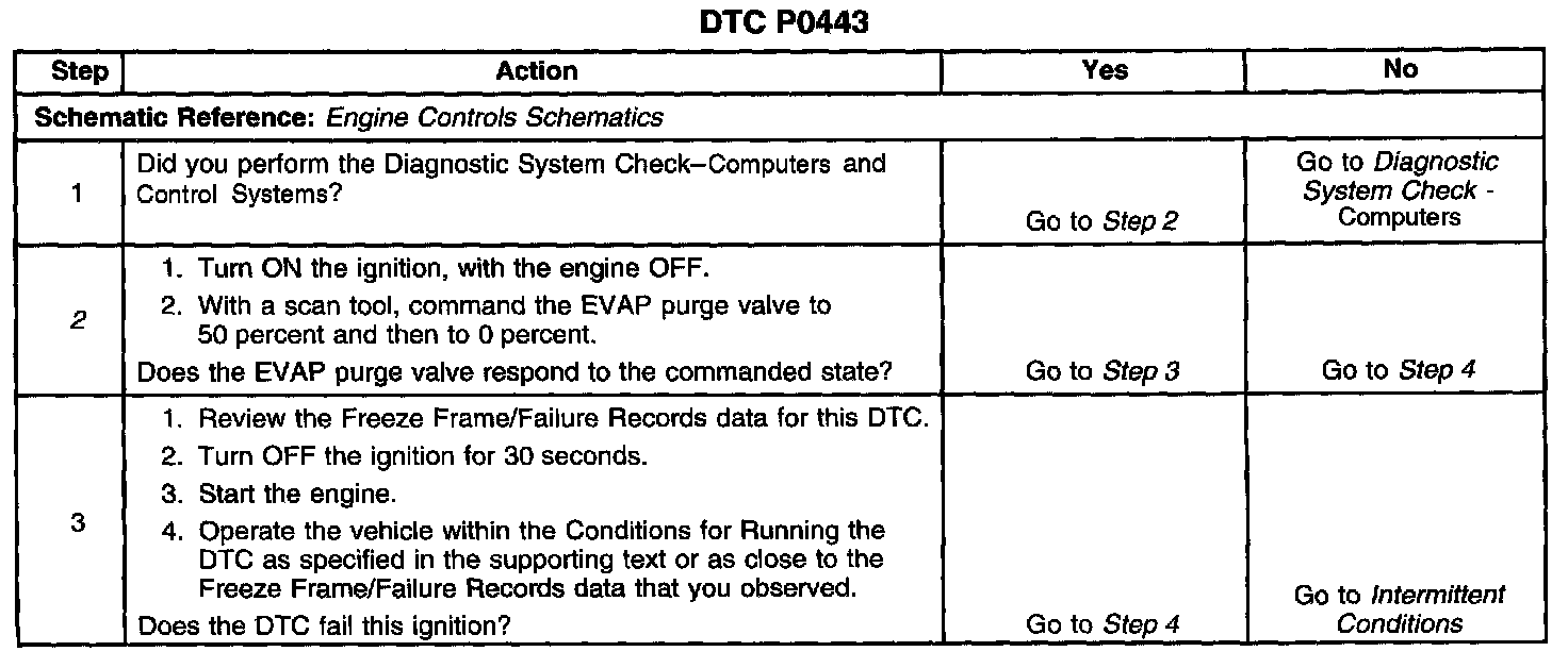 CIRCUIT DESCRIPTIONAn ignition voltage is supplied directly to the Evaporative Emission (EVAP) purge valve. The EVAP purge valve is Pulse Width Modulated (PWM). The control module controls the EVAP purge valve on time by grounding the control circuit via an internal switch called a driver. The scan tool displays the amount of on time as a percentage. The control module monitors the status of the driver. If the control module detects an incorrect voltage for the commanded state of the driver, DTC P0443 sets.