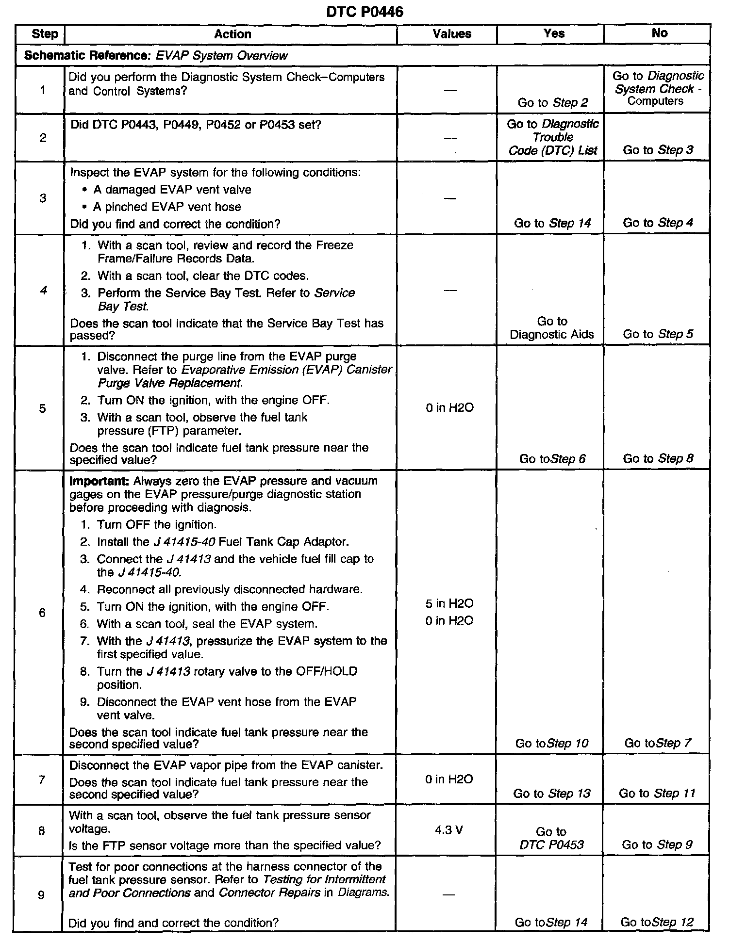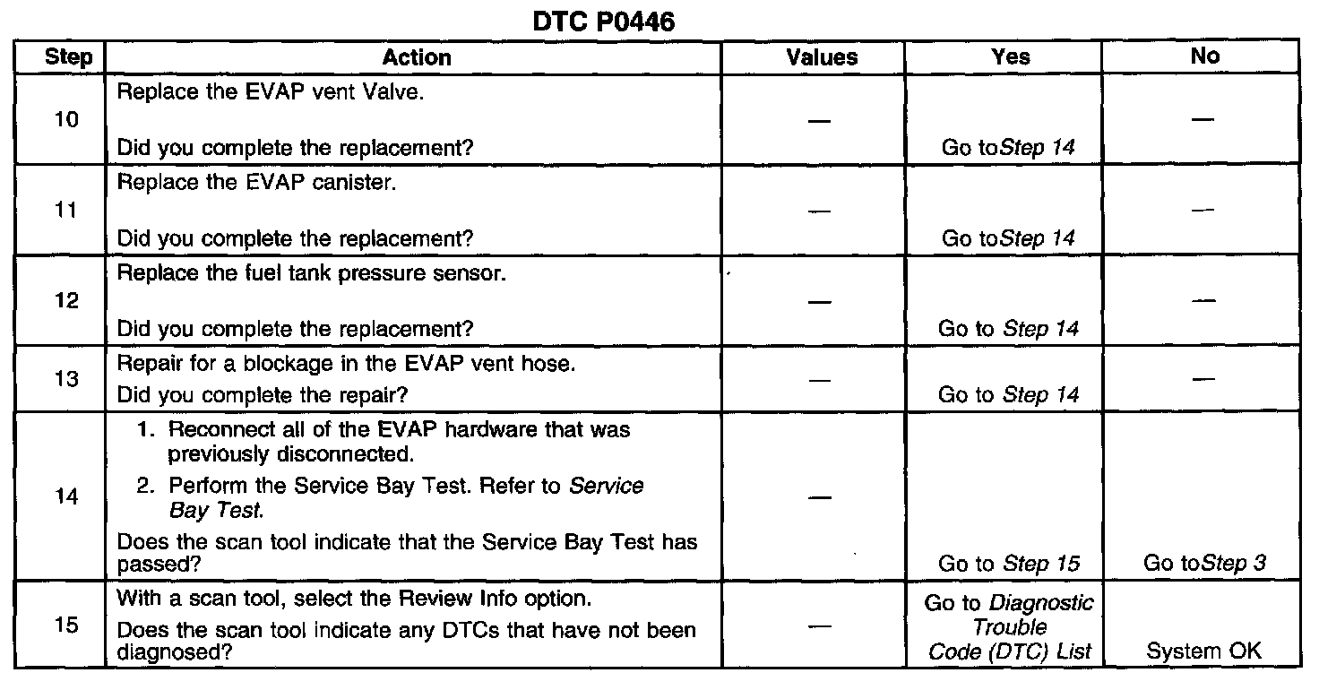 DESCRIPTIONA restricted or blocked Evaporative Emission (EVAP) vent path is detected by the control module commanding the purge valve ON (open) and the vent valve ON (closed) allowing a vacuum to be applied to the EVAP system. Once a calibrated vacuum level has been reached, the control module commands the purge valve OFF (closed) and the vent valve OFF (open) while monitoring the Fuel Tank Pressure (FTP) sensor for a decrease in vacuum. If the vacuum does not decrease to near 0 inches H2O in a calibrated time, DTC P0446 will set.