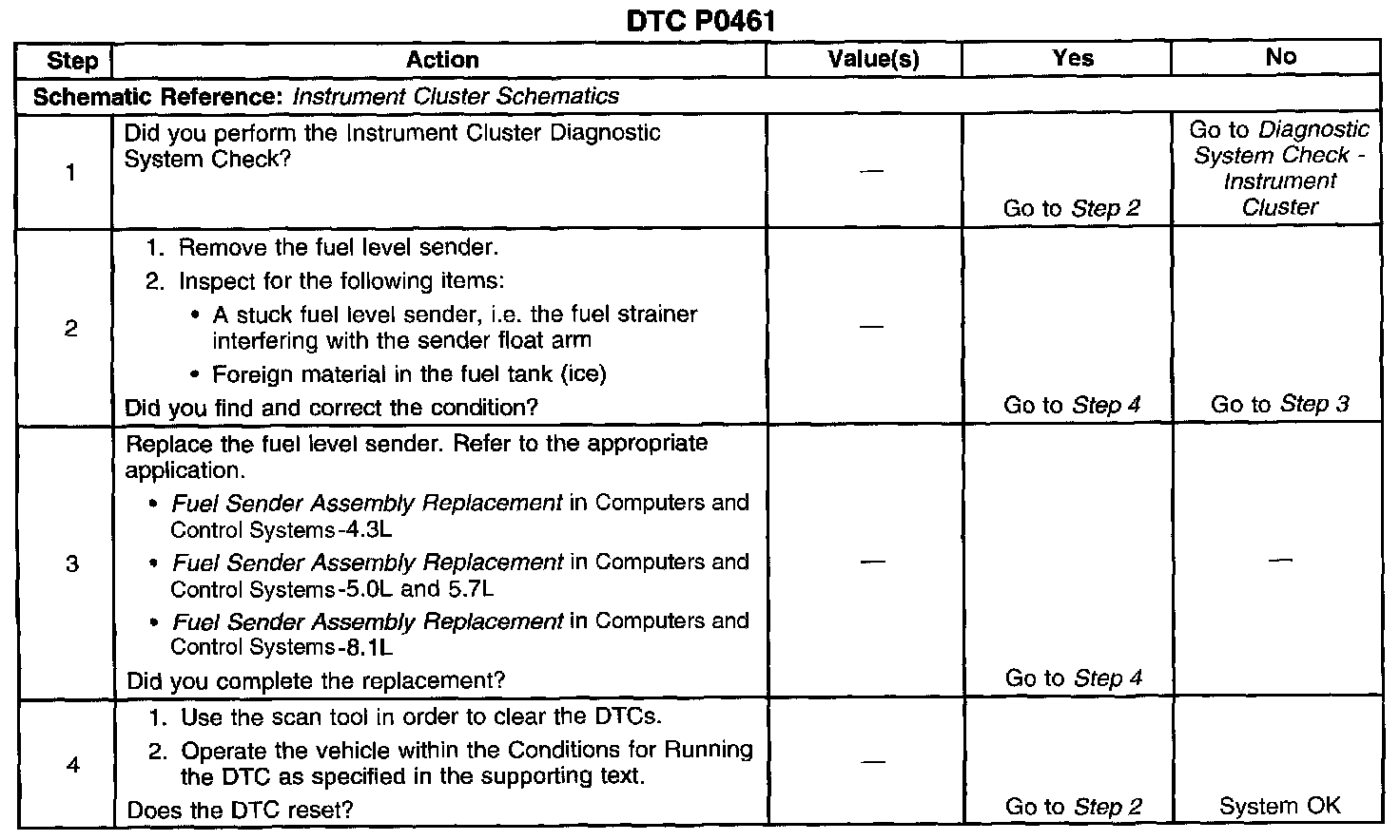 CIRCUIT DESCRIPTIONThe fuel level sender changes resistance based on fuel level. The PCM monitors the signal circuit of the fuel level sender in order to determine fuel level. When the fuel tank is full, the sender resistance is high and the PCM senses a high signal voltage. When the fuel tank is empty, the sender resistance is low and the PCM senses a low signal voltage. The PCM uses the signal circuit of the fuel level sender in order to calculate the total remaining fuel %) in the tank. The PCM sends the fuel level percent via the class 2 serial data circuit to the instrument cluster in order to control the fuel gauge. The fuel level information is also used for misfire and EVAP diagnostics.