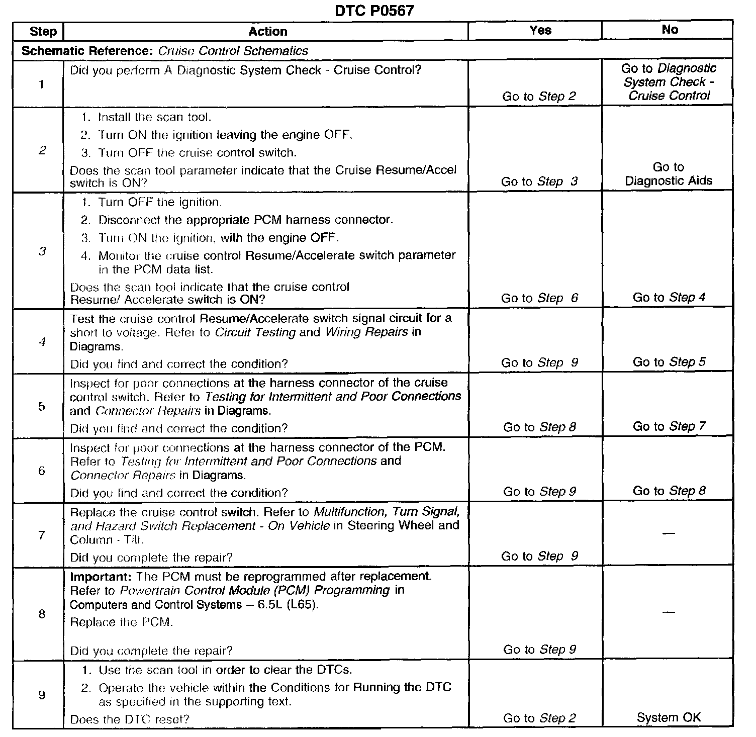 CIRCUIT DESCRIPTIONThe Cruise Resume/Accel switch is an input to the Powertrain Control Module (PCM). This allows the PCM to control and hold a requested speed. The Cruise Resume/Accel switch sends an ignition positive voltage signal to the PCM when the switch is applied. This DTC sets if the PCM senses a voltage on the Resume/Accelerate switch signal circuit when voltage is not expected.