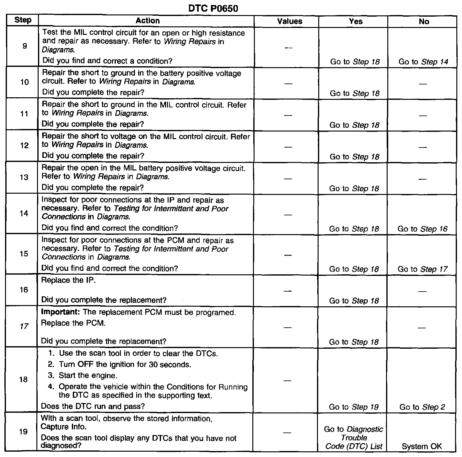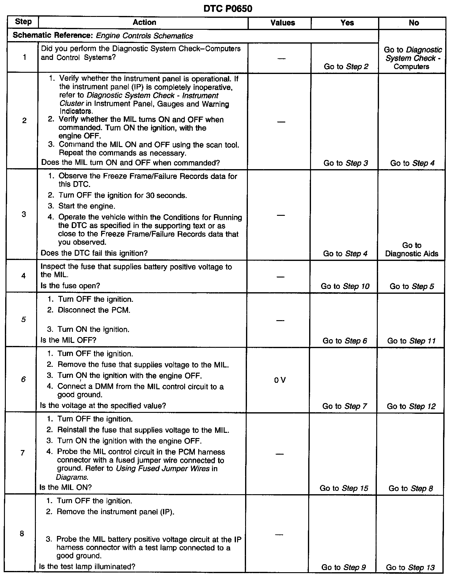 5. This step tests for a short to ground in the MIL control circuit. With the PCM disconnected and the ignition ON the MIL should be OFF.