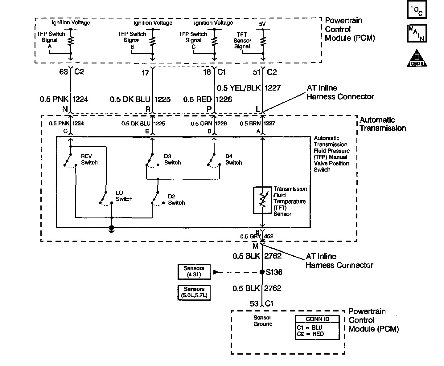 The automatic transmission Fluid Temperature (TFT) sensor is part of the automatic Transmission Fluid Pressure (TFP) manual valve position switch. The TFT sensor is a resistor, or thermistor, which changes value based on temperature. The sensor has a negative-temperature coefficient. This means that as the temperature increases, the resistance decreases, and as the temperature decreases, the resistance increases. The Powertrain Control Module (PCM) supplies a 5-volt reference signal to the sensor on the TFT sensor signal circuit and measures the voltage drop in the circuit. When the transmission fluid is cold, the sensor resistance is high and the PCM detects high signal voltage. As the fluid temperature warms to a normal operating temperature, the resistance becomes less and the signal voltage decreases. The PCM uses this information to control shift quality and torque converter clutch apply.