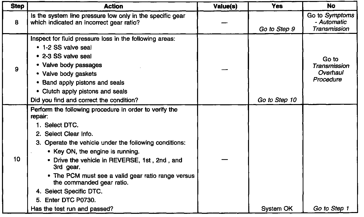 ^ DTC P0730 defaults to an elevated line pressure condition which may result in TCC partial apply.