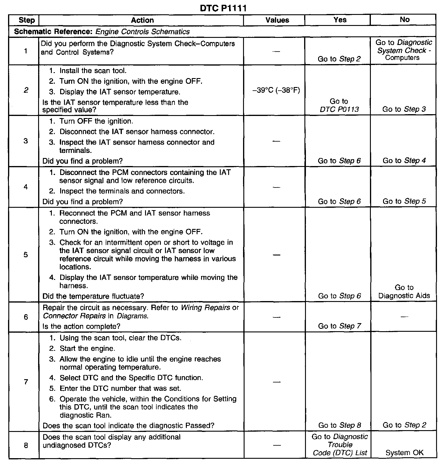 2. If the IAT sensor temperature is less than -39°C (-38°F) then the condition is present. Even though DTC P0113 did not set, this DTC is more comprehensive and may aid in diagnosis.