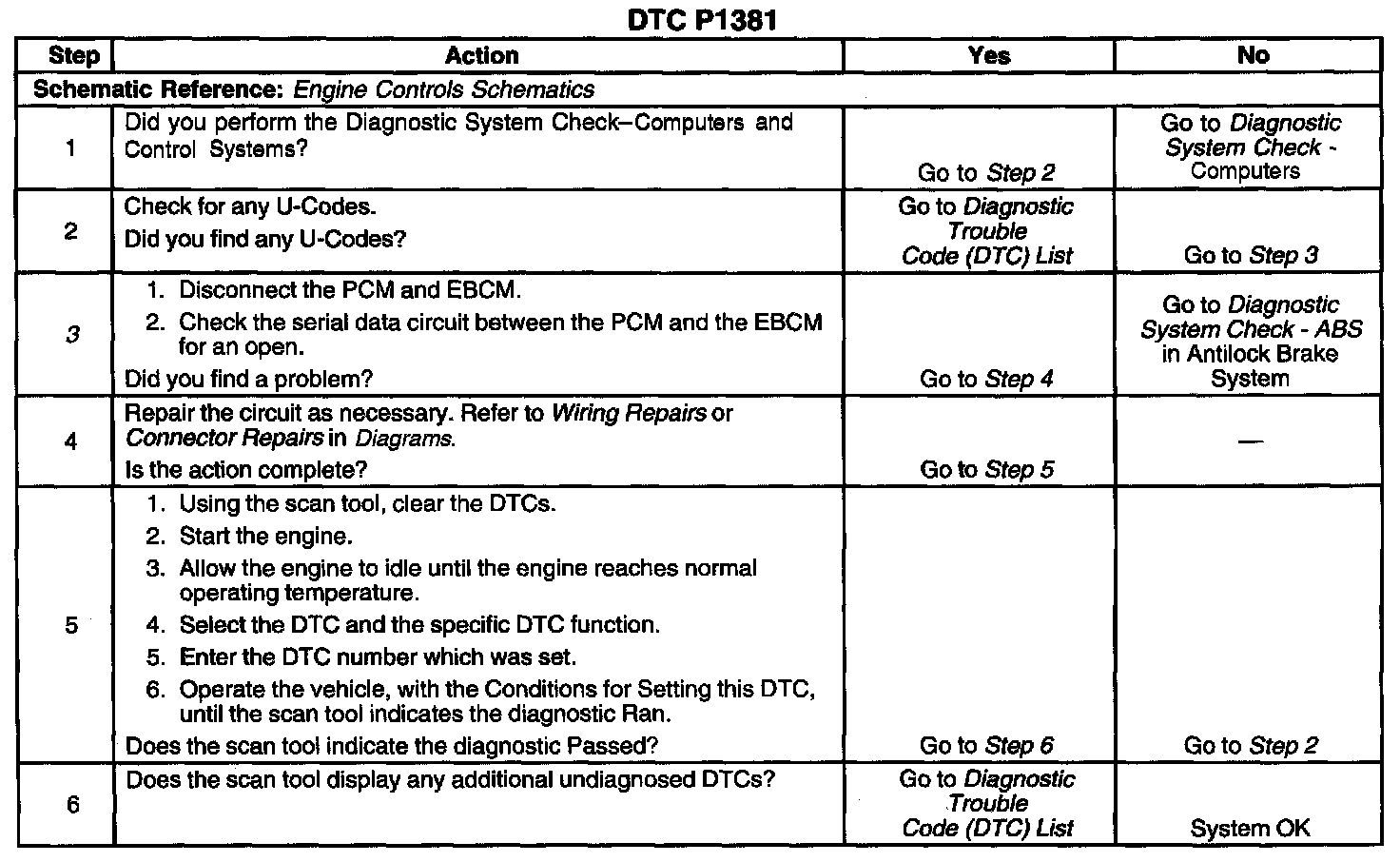 CIRCUIT DESCRIPTIONThis diagnostic will detect a loss of serial communication from the Electronic Brake Control Module (EBCM) to the control module. This serial communication is essential in order to distinguish misfire from a rough road condition.