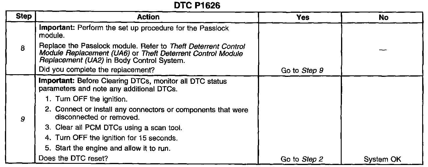 ^ If the Class 2 Serial Data circuit is shorted to ground or shorted to voltage, then all systems connected to the serial data circuit will not be able to communicate properly. Systems capable of storing loss of communications DTCs, or the DTCs with the letter U" as a prefix, will have these codes stored in their memory. If a DTC U1192 is stored in the PCM memory along with the P1626, then a fault occurred at some point after the PCM received the correct password. The theft system must also be checked for intermittent operation due to a loss of power or ground to the module itself. After repairing the cause of DTC P1626, clear all DTCs from the systems capable of storing this DTC and DTC U1192.