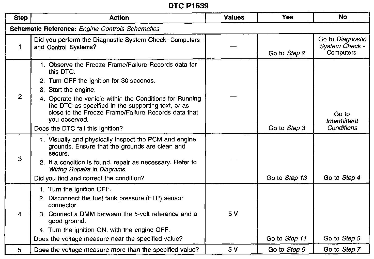 CIRCUIT DESCRIPTIONThe Powertrain Control Module (PCM) uses the 5-volt reference 2 circuit as a sensor feed for the Fuel Tank Pressure (FTP) sensor. The PCM monitors the voltage on the 5-volt reference 2 circuit. If the voltage is out of tolerance, the PCM will set DTC P1639.