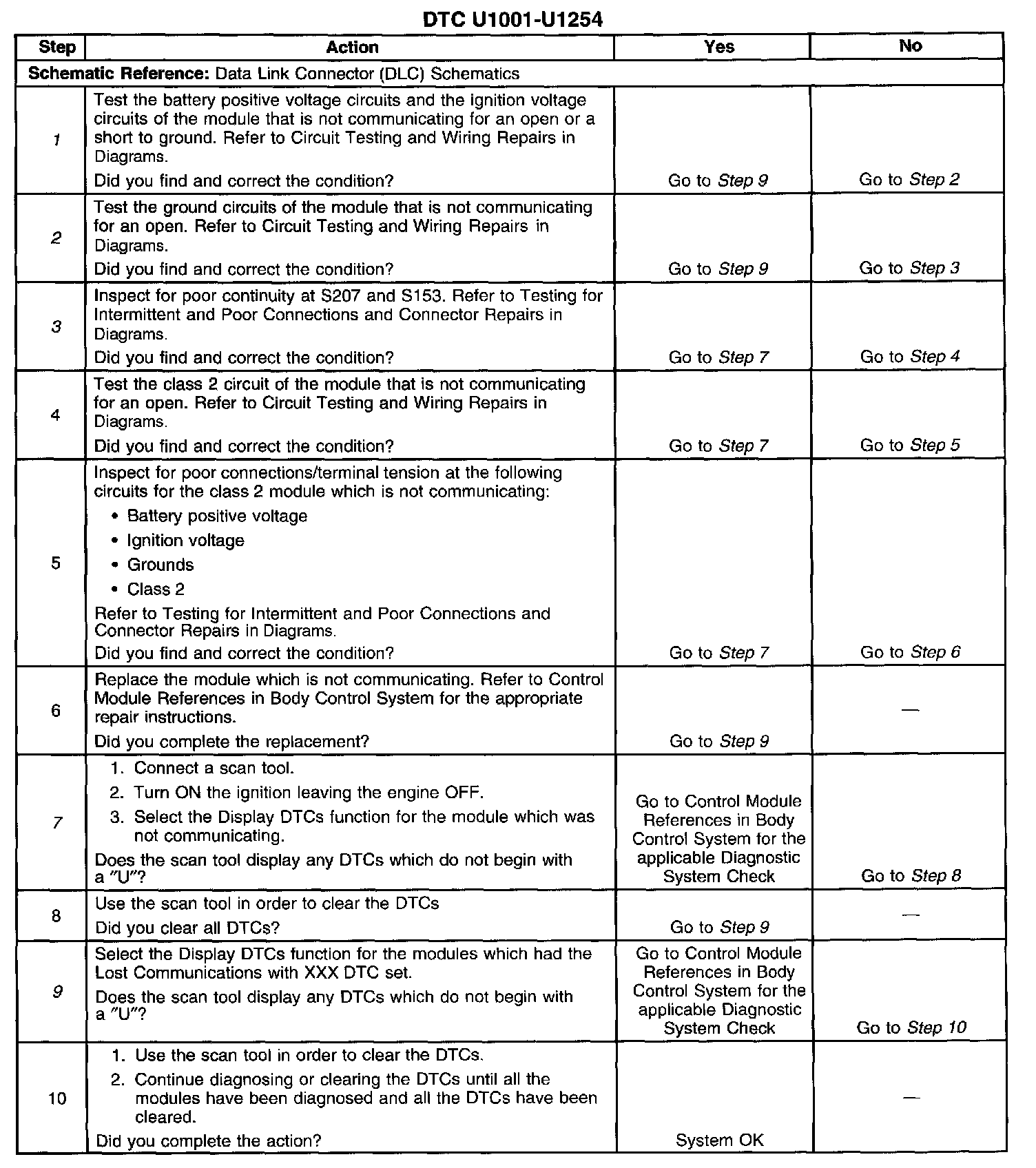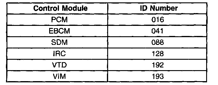 The Control Module ID Number list provides a method for determining which module is not communicating. A module with an internal class 2 serial data circuit malfunction or which loses power during the current ignition cycle would have a Lost Communication DTC set by other modules. Use the Control Module ID Number list in order to determine which module is not communicating and the Lost Communications with XXX diagnostic table in order to diagnose the malfunction. When no message is detected from a learned identification number for five seconds, a DTC U1xxx is set.