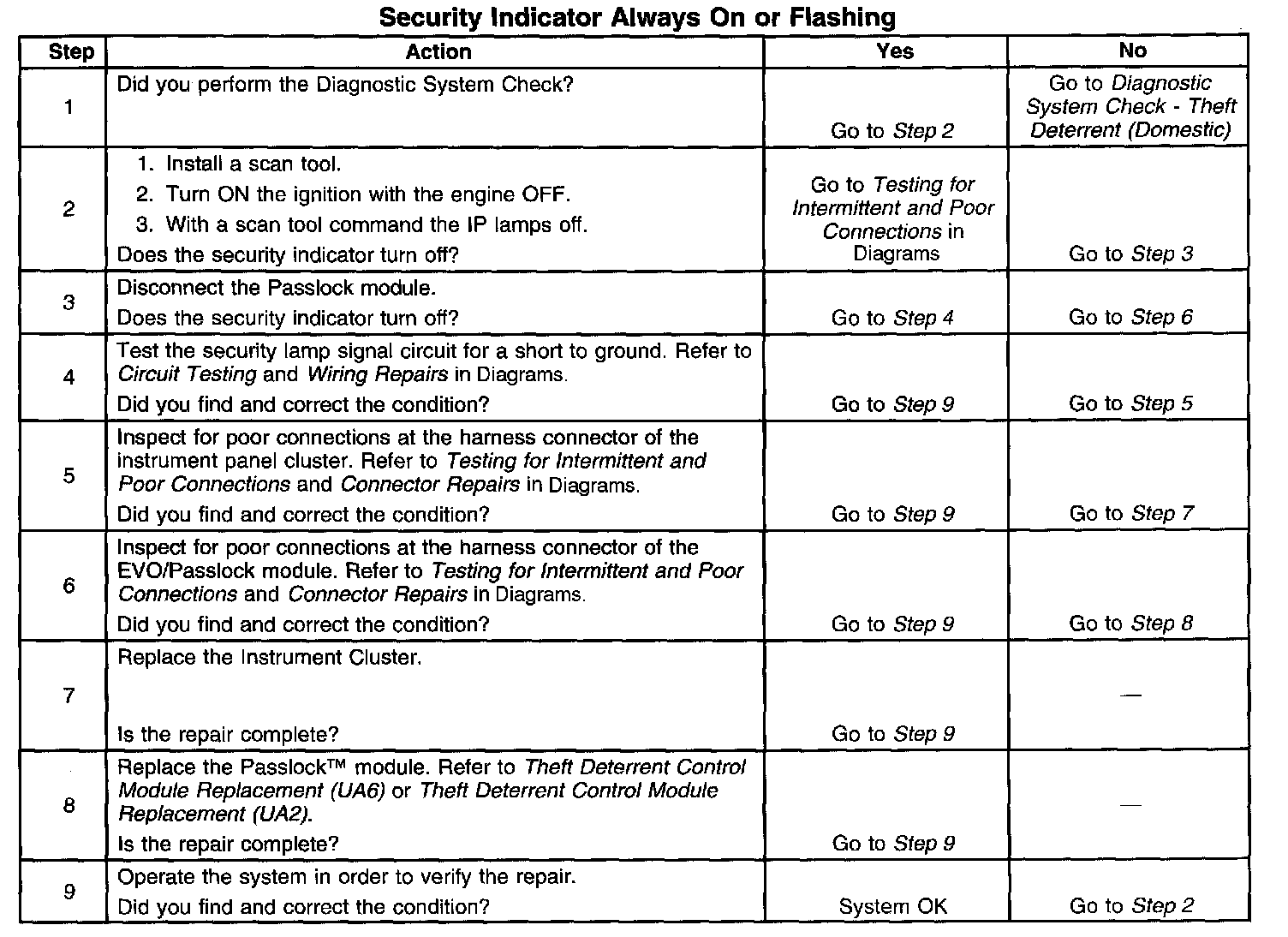 The diagnostics in this table are designed to troubleshoot non DTC troubles. For example Battery power, Ignition 1 input, and shorted or open SECURITY indicator circuit.