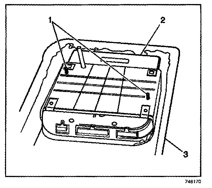 1. Slide the video screen (2) in the open position into the overhead console (3) through the opening in the front of the overhead console until seated.