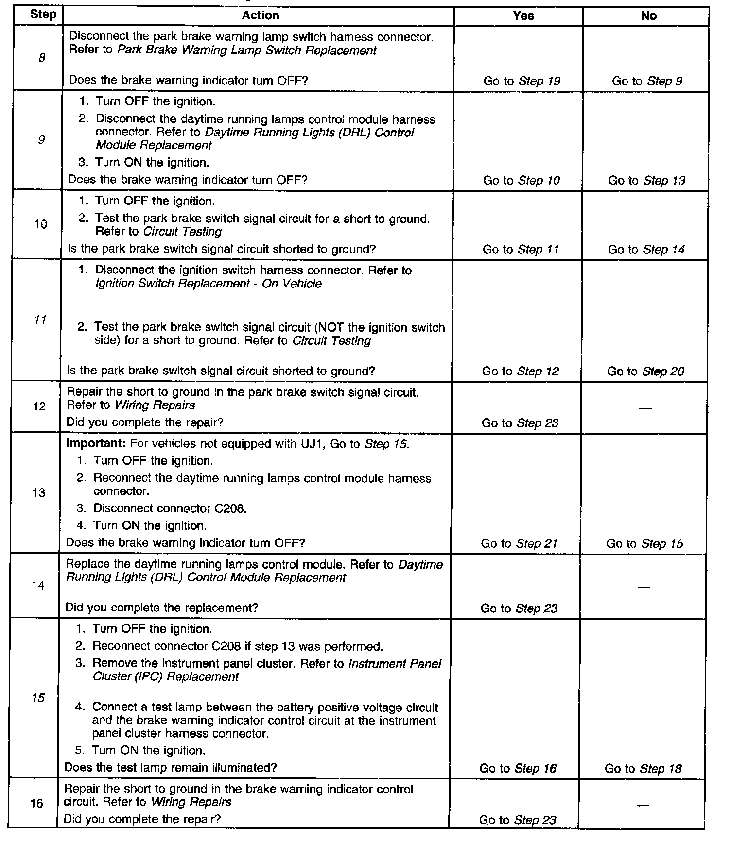9. This step tests if the DRL control module is applying ground to the brake warning indicator.