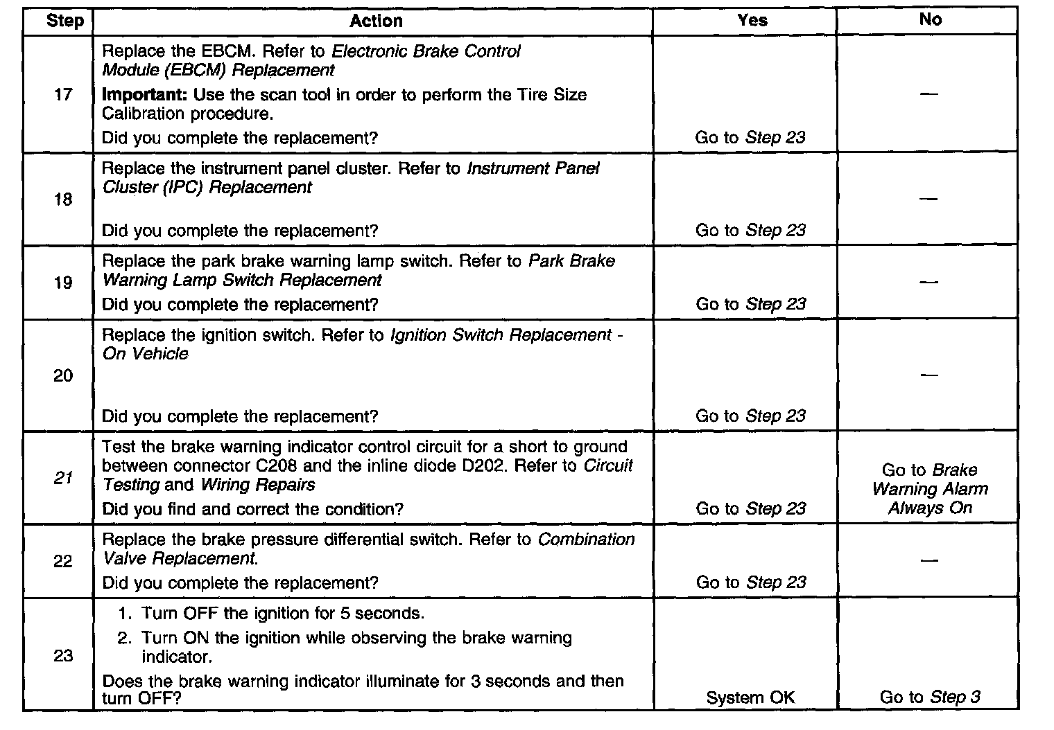 21. If no short is found, the brake warning indicator supply voltage 2 circuit is shorted to ground or the p/b booster fluid flow and pressure alarm delay module is applying ground to the circuit. Another malfunction is preventing the p/b booster fluid flow alarm from sounding.