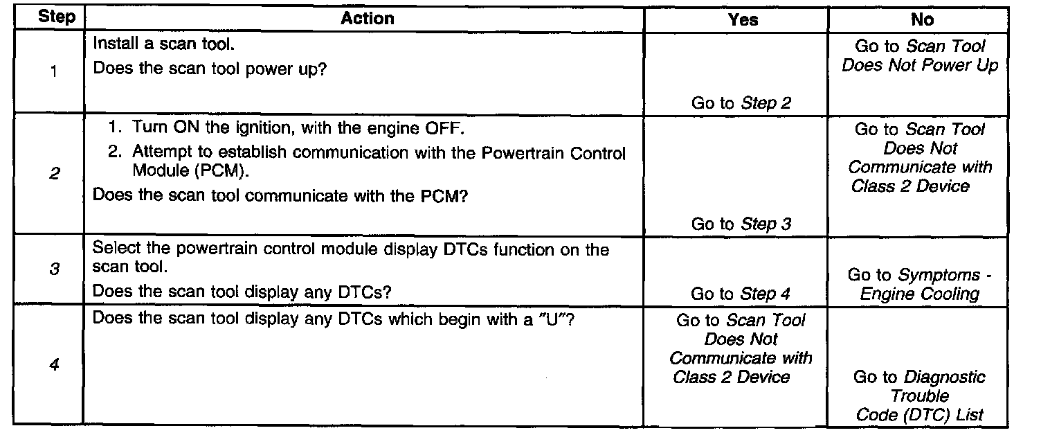 2. Lack of communication may be due to a partial malfunction of the class 2 serial data circuit or due to a total malfunction of the class 2 serial data circuit. The specified procedure will determine the particular condition.