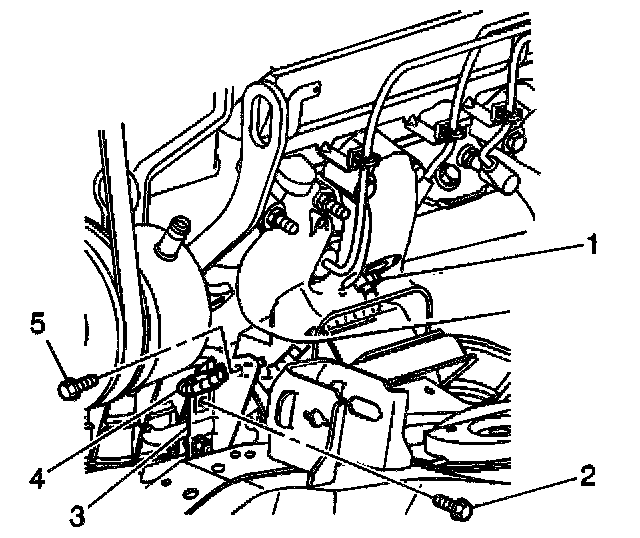 4. Remove the bolt (2) retaining the bracket to the engine block.