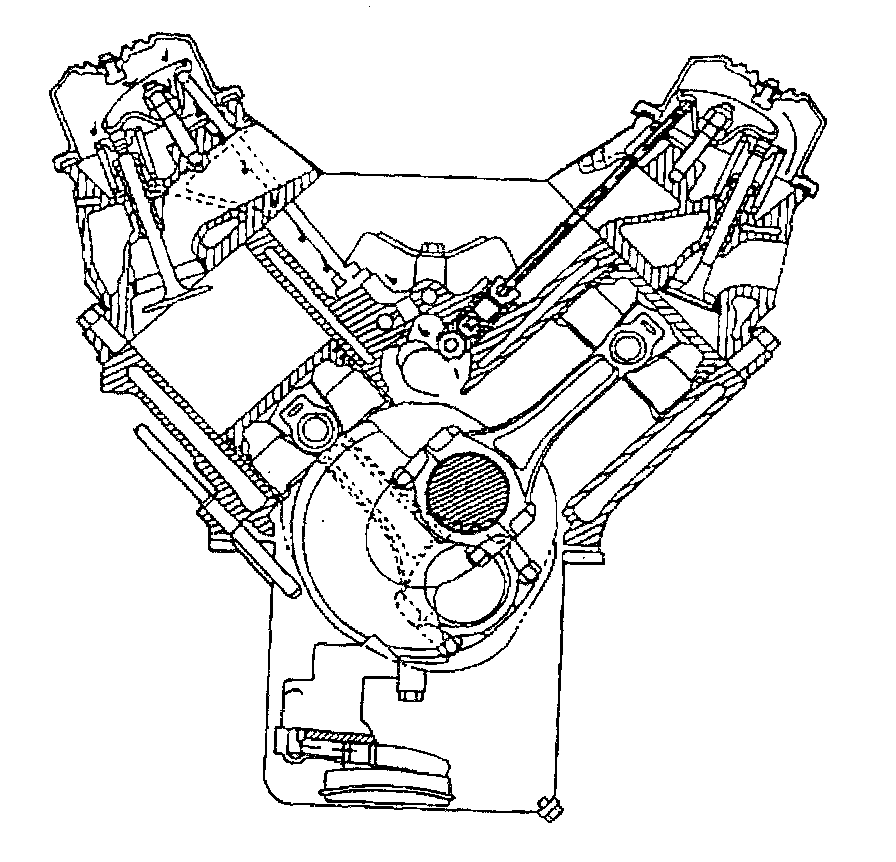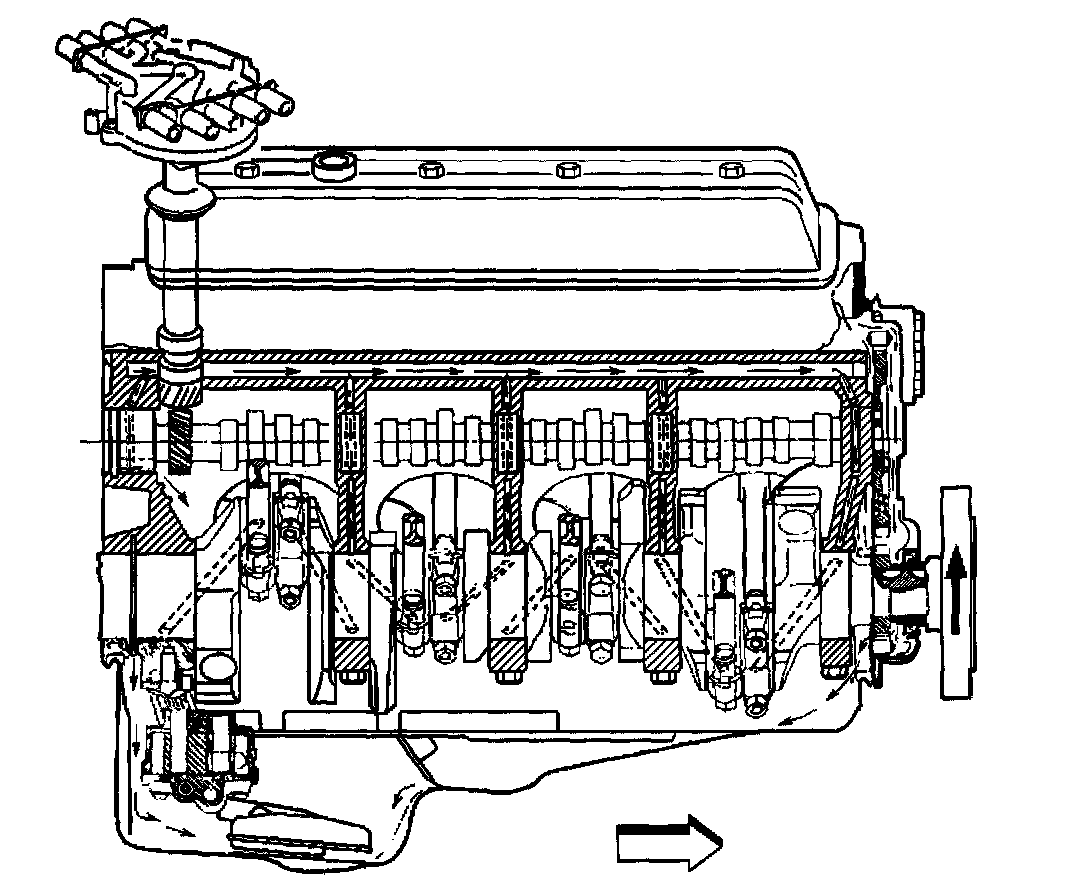 The gear-type oil pump is driven through an extension driveshaft. The extension driveshaft is driven by the distributor which is gear driven by the camshaft. The oil is drawn from the oil pan through a pickup screen and tube. Pressurized oil is delivered through internal passages in order to lubricate the camshaft and the crankshaft bearings and to provide lash control in the hydraulic valve lifters. Oil is metered from the valve lifters, through the valve pushrods in order to lubricate the valve rocker arms and valve rocker arm ball pivots. Oil returning to the oil pan from the cylinder heads and the camshaft front bearing, lubricates the camshaft timing chain and the crankshaft and the camshaft sprockets.