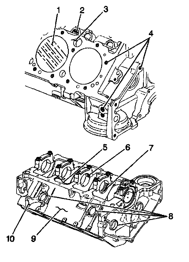 - The crankshaft bearing caps (6) and the crankshaft bearing bores (7) for damage
