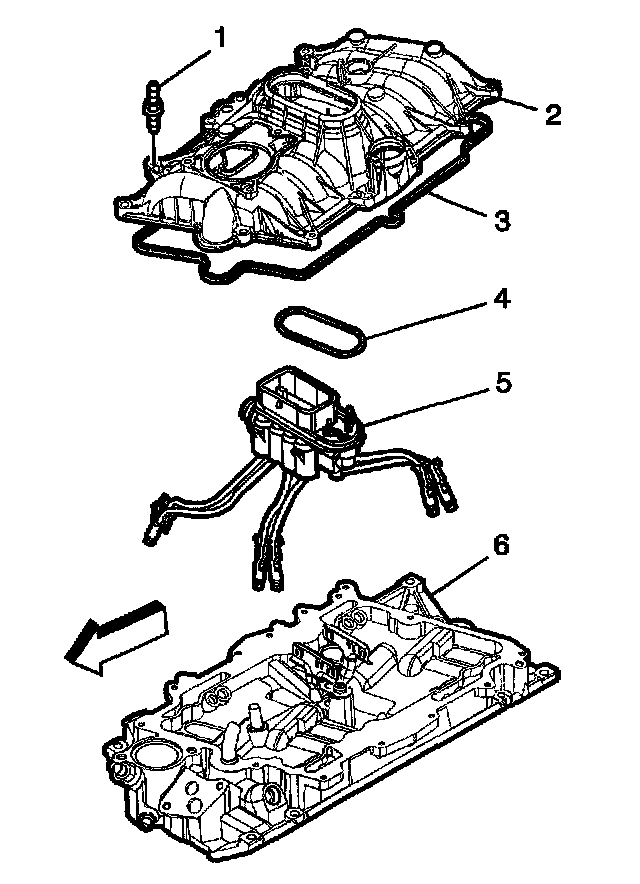 6. Install the upper intake manifold (2) onto the lower intake manifold (6).