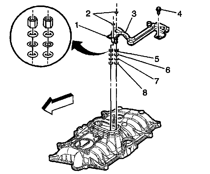 7. If reusing the fasteners, apply threadlock GM P/N 12345382 or equivalent to the threads of the upper intake manifold attaching studs (1).