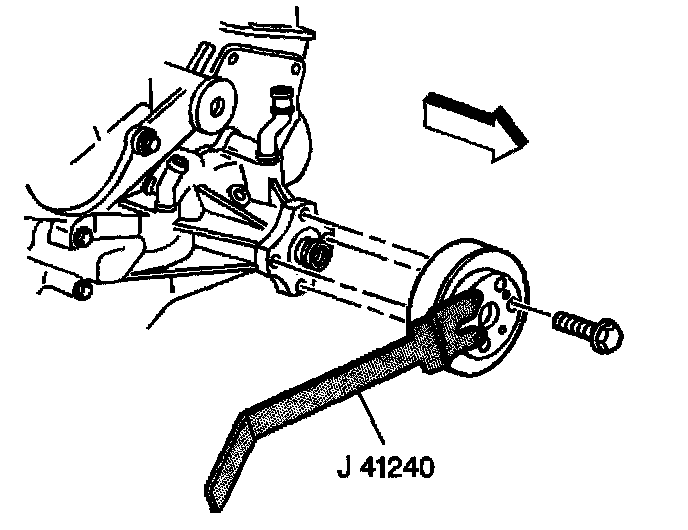 6. Install the fan and water pump pulley and bolts using the J 41240.