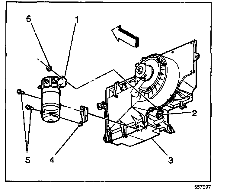 ^ Tighten the nut (6) retaining the accumulator (1) to the A/C evaporator and blower module stud (2) to 16 N.m (12 lb ft).