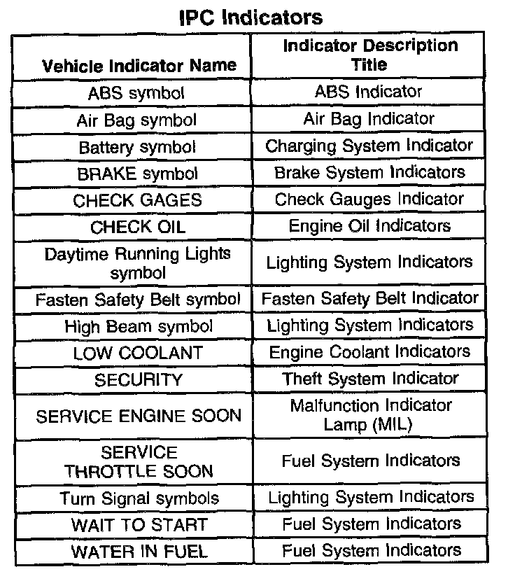 The indicator description and operation uses generic indicator names. Refer to the table for the indicators that are available on this vehicle: