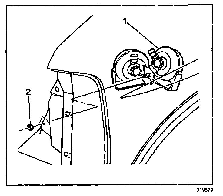 5. Install the nut (2) in order to retain the horn mounting bracket (1) to the vehicle.