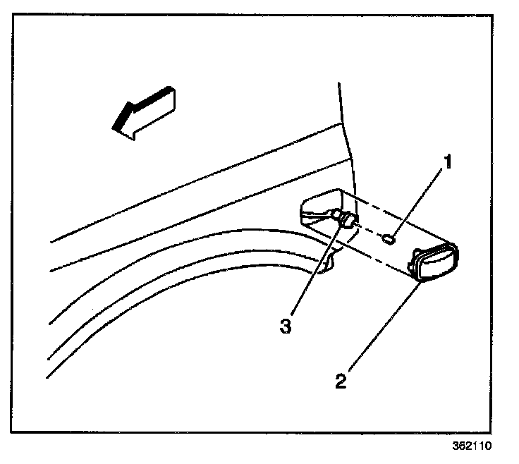REMOVAL PROCEDURE1. Push the light assembly (2) towards the front of the vehicle while gently prying the rear edge of the light assembly away from the fender in order to remove the light assembly.