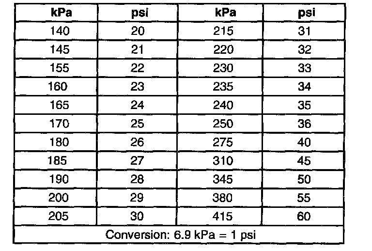 Inflation Pressure Conversion (Kilopascals to PSI)
