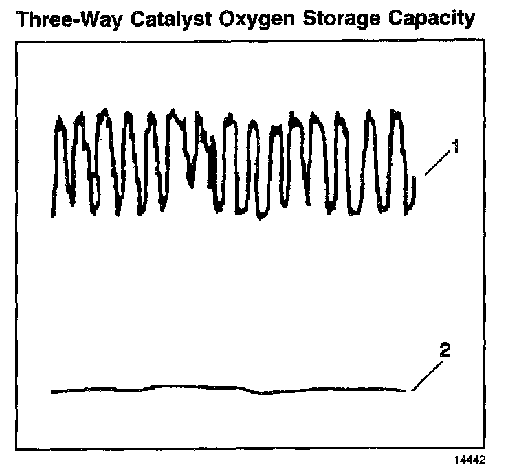 The PCM must monitor the 3-way catalyst system (TWC) for efficiency. In order to accomplish this, the PCM monitors the pre-catalyst and post-catalyst oxygen sensors. When the TWC is operating properly, the post-catalyst (2) oxygen sensor shows significantly less activity than the pre-catalyst (1) oxygen sensor. The TWC stores oxygen during the normal reduction and oxidation process. The TWC releases oxygen during its normal reduction and oxidation process. The PCM calculates the oxygen storage capacity using the difference between the pre-catalyst and post-catalyst oxygen sensor voltage levels.