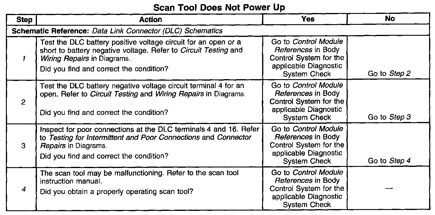 CIRCUIT DESCRIPTIONThe DLC provides battery positive voltage for the scan tool at terminal 16 and ground at terminal 4. The DLC provides the class 2 signal at terminal 2 and signal ground at terminal 5. The scan tool will power up with the ignition OFF.