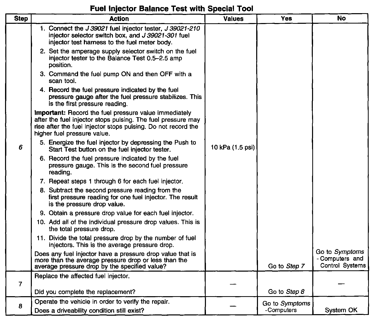 6. If the pressure drop value for each fuel injector is within 10 kPa (1.5 psi) of the average pressure drop value, the fuel injectors are flowing properly. Calculate the pressure drop value for each fuel injector by subtracting the second pressure reading from the first pressure reading.