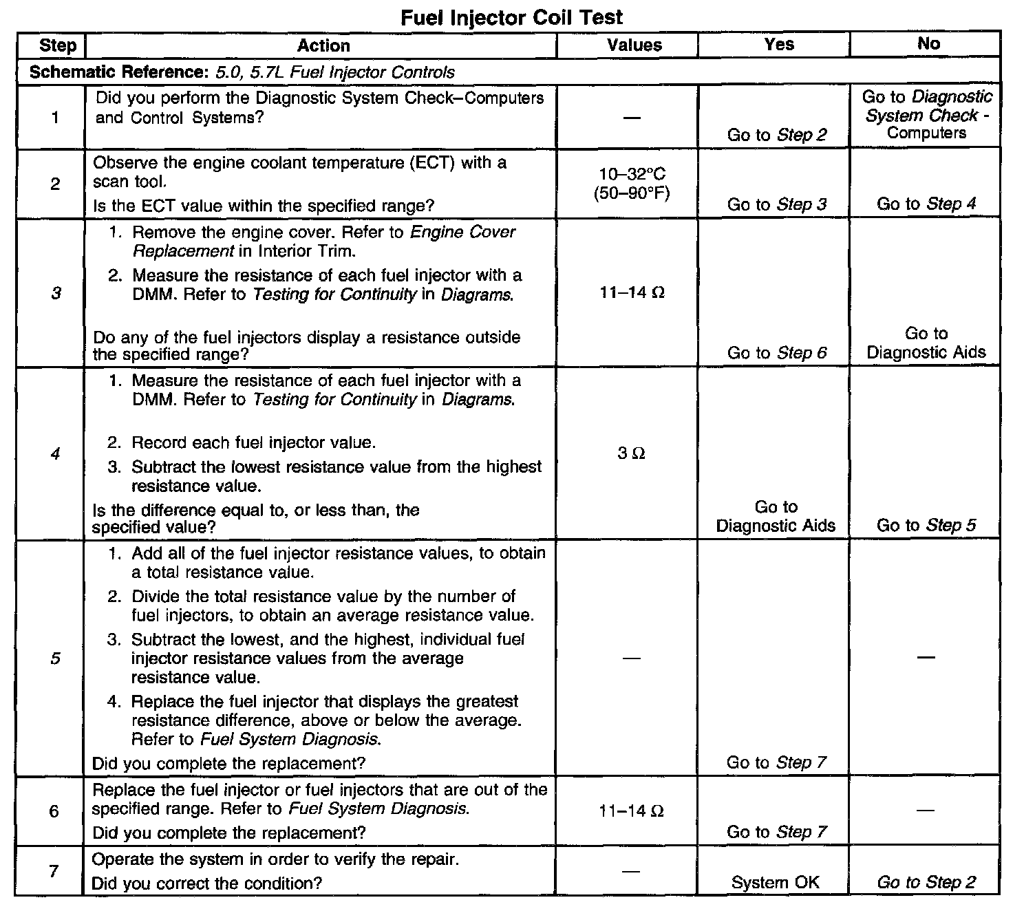 ^ Perform the fuel injector coil test within the conditions of the customers concern. A fuel injector condition may only be apparent at a certain temperature, or under certain conditions.