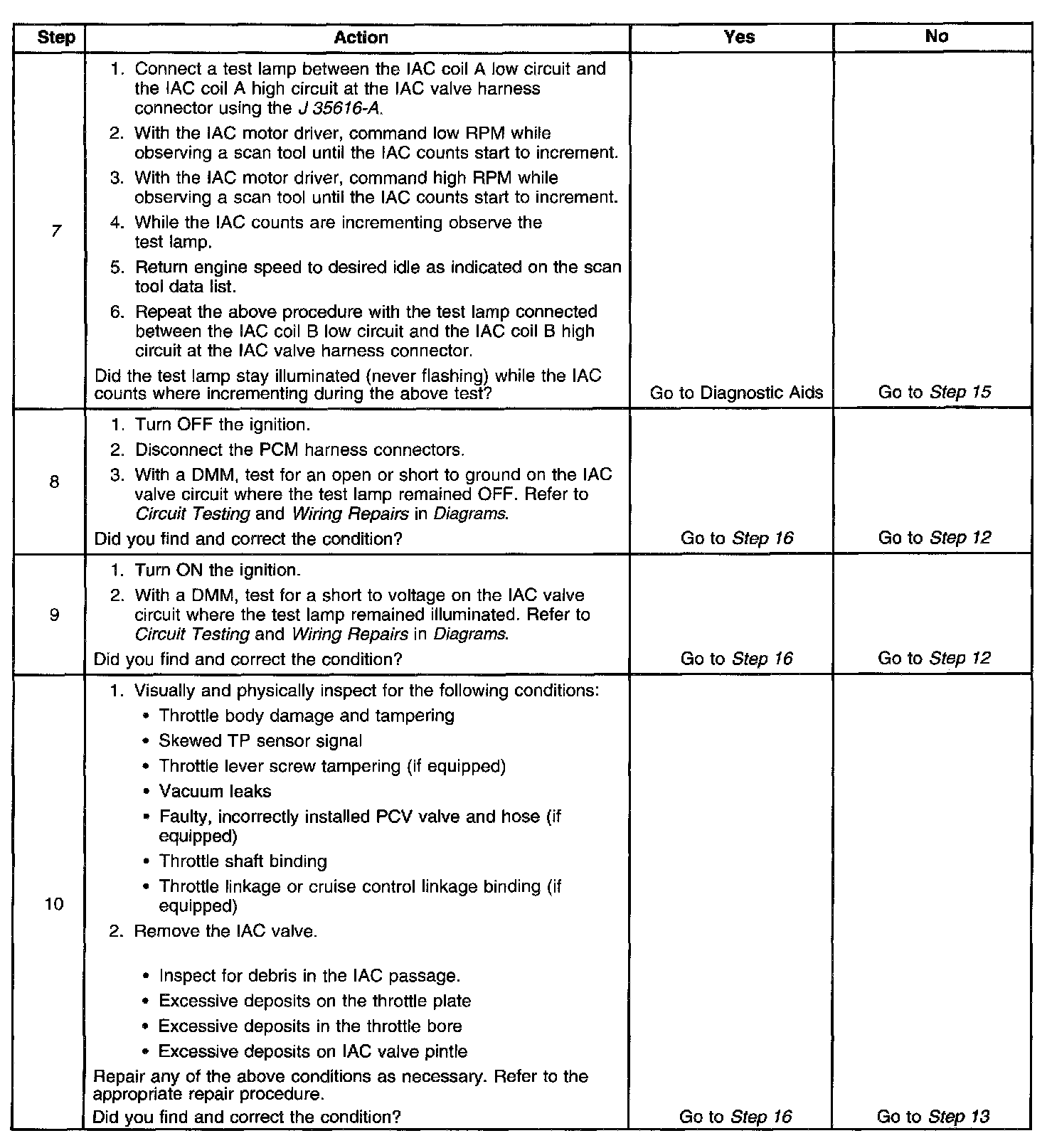 7. This test will determine the ability of the PCM to provide the IAC valve circuits with a ground. On a normally operating system, the test lamp should not flash while the IAC counts are incrementing.