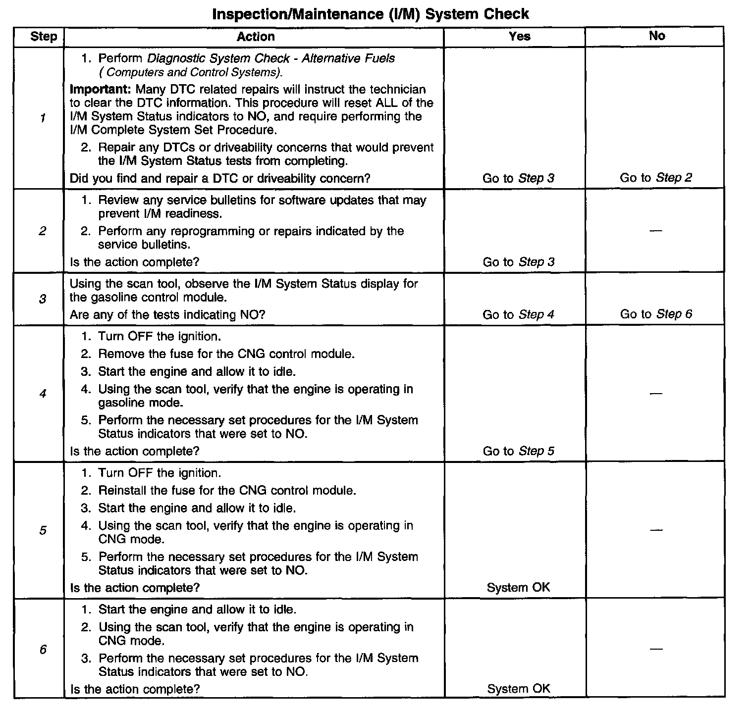 DESCRIPTIONDue to the nature of the vehicles designed to run on fuels other than gasoline, some additional procedures may be required in order to set the I/M System Status indicators to YES. Vehicles designed to run on both gasoline and compressed natural gas (CNG) will disable certain diagnostic tests when the vehicle is operating on CNG. These vehicles will require operation using gasoline in order for the remaining tests to run. The System Set procedures for gasoline vehicles can be used once the vehicle is operating on gasoline.