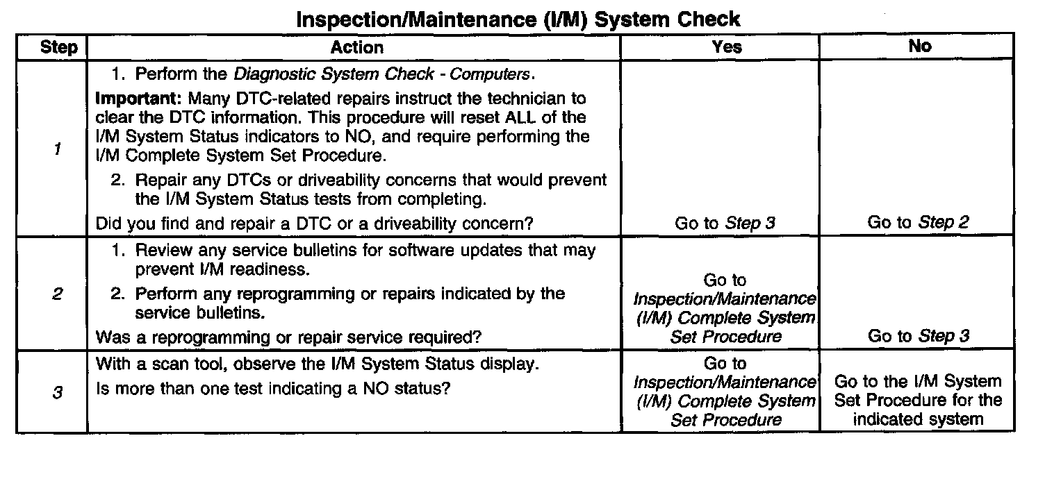 1. Any DTCs that set, even DTCs that are not listed in the Inspection/Maintenance System DTC Table, may prevent the required DTCs from running. If there is any question as to whether a set DTC is disabling the required I/M diagnostic, review the Conditions for Running in the diagnostic procedures for the DTC that is required by the I/M diagnostic. A list of disabling DTCs, if applicable, is in the supporting text for that DTC.