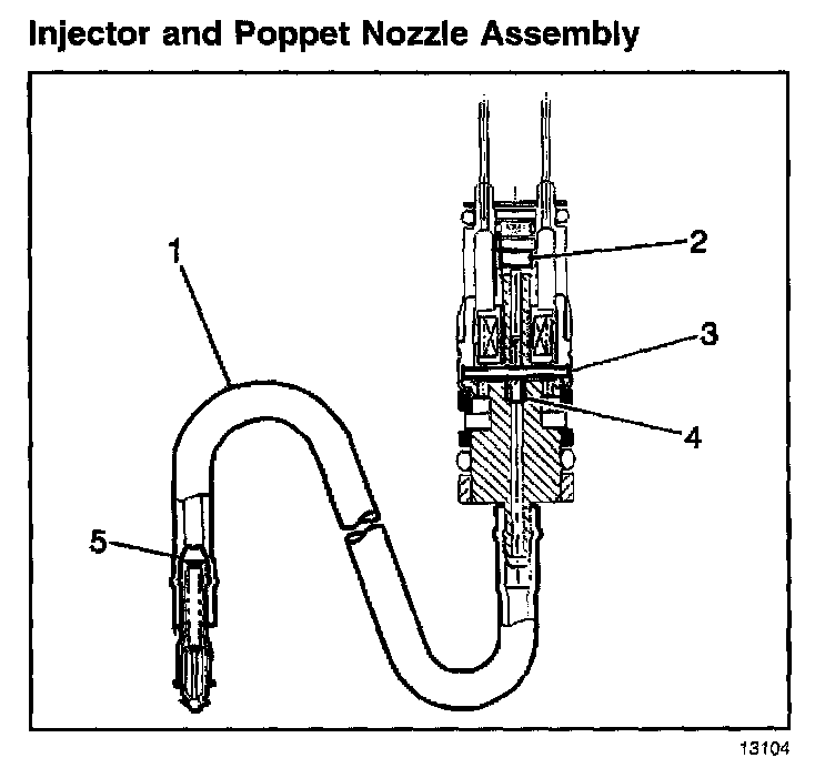 Each fuel injector assembly is a solenoid operated device, controlled by the control module. The fuel injector assembly meters the pressurized fuel through a poppet nozzle valve (5) to a single engine cylinder. The control module energizes the flow control solenoid (2), which opens an armature valve (3). Fuel is allowed to flow past the valve and through a flexible fuel pipe (1) to the poppet nozzle valve. An increase in fuel pressure causes the poppet nozzle ball to open from a seat against the extension spring force. This allows the fuel to flow from the nozzle.