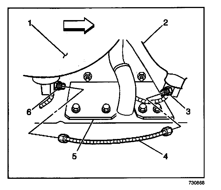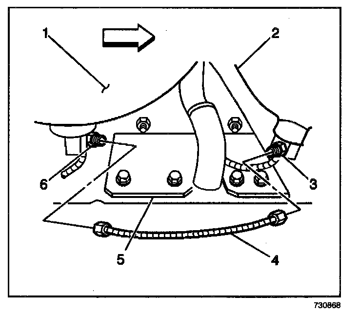 5. Connect the fuel inlet line (4) at the front tank (1) high pressure lock-off solenoid fitting (6) using new O-rings. Lubricate the O-rings with petroleum jelly or equivalent.