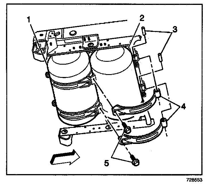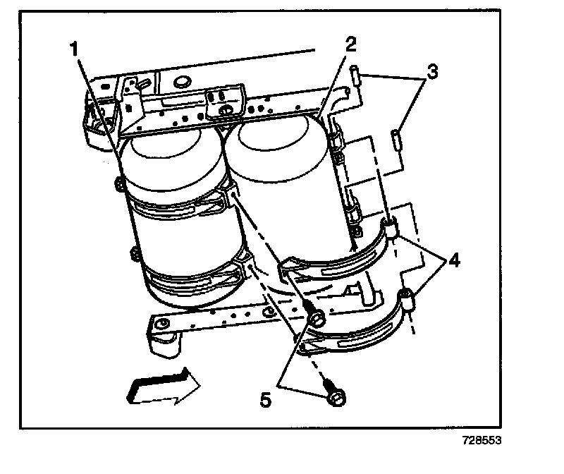 4. Install the new tank strap mounting nuts and bolts (5).