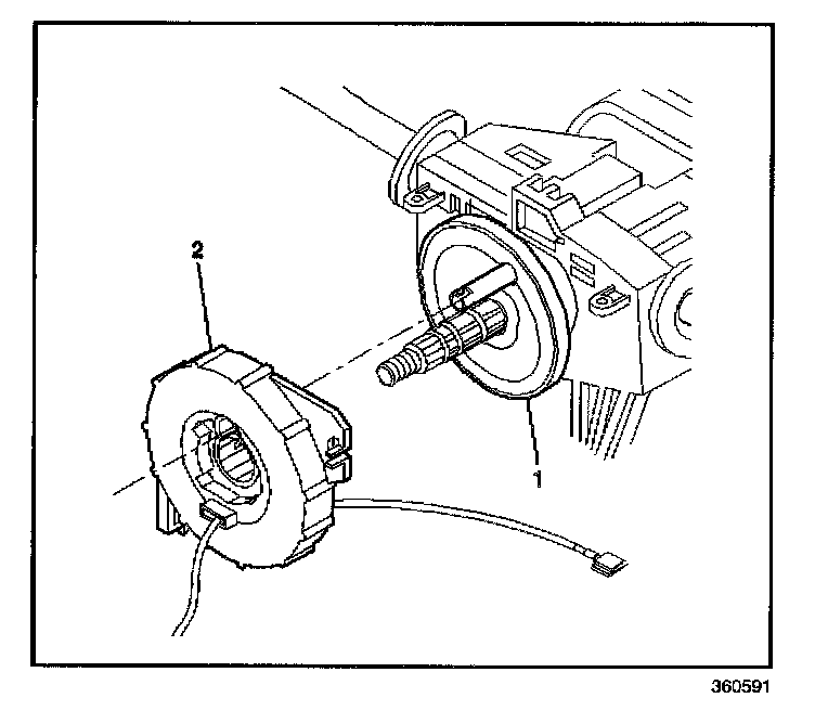 3. Align the SIR steering wheel module coil (2) with the horn tower on the turn signal cancel cam (1)