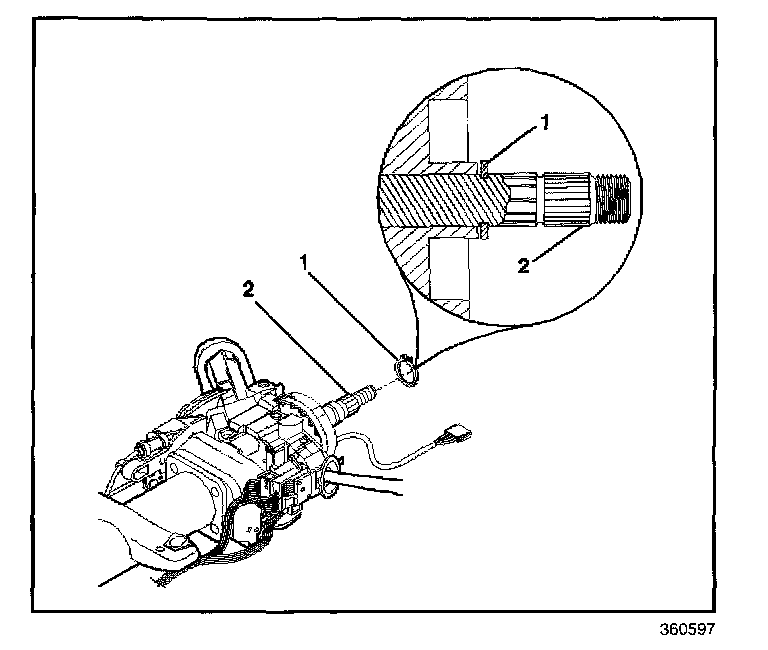6. Install the SIR steering wheel module coil retaining ring. Verify that the ring (1) is firmly seated in the groove on the upper shaft (2).