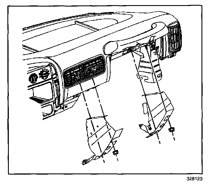 2. Remove the nuts that retain the instrument panel knee bolster inner and outer brackets to the instrument panel carrier.